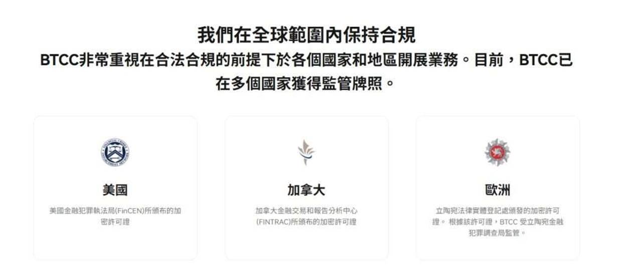 截止目前,BTCC 已獲得美國、加拿大和歐洲等多個重要市場的加密貨幣金融牌照。這些國際認可不僅是形式上的證明,更代表 BTCC 在營運和資產安全上必須遵循當地最嚴苛的法律標準,為用戶提供可靠的投資環境。