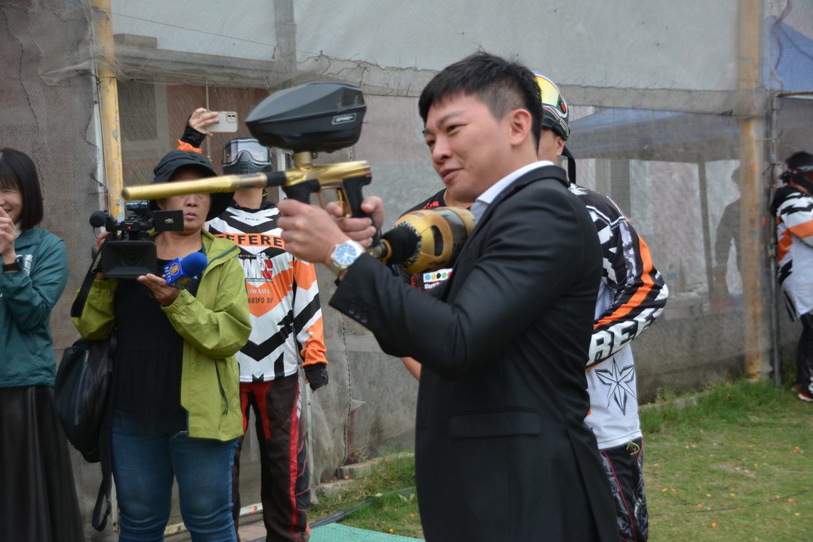 圖/教育局長吳立森親自下場試練漆彈,與全場親子打成一遍。(記者陳雯萍攝)
